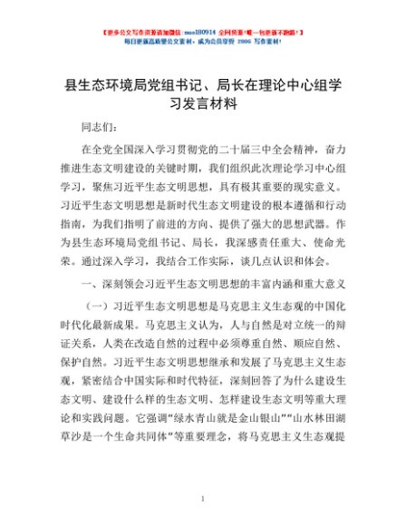 / 县生态环境局党组书记、局长在理论中心组学习发言材料