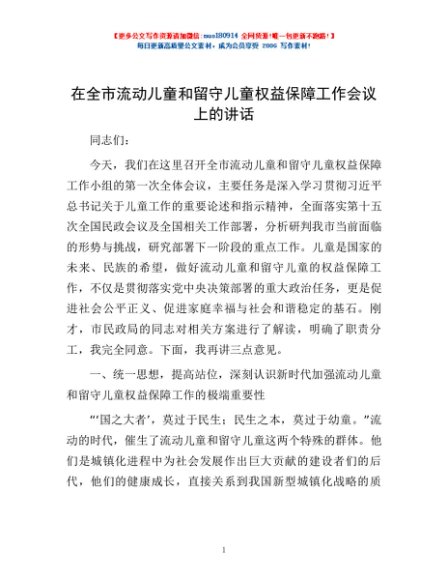 / 在全市流动儿童和留守儿童权益保障工作会议上的讲话