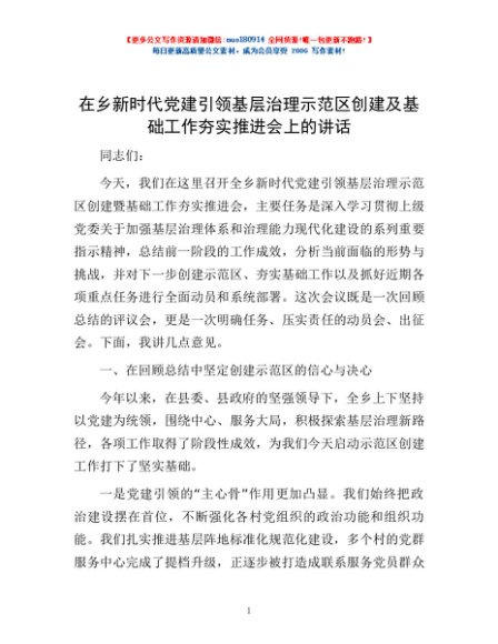 / 在乡新时代党建引领基层治理示范区创建及基础工作夯实推进会上的讲话