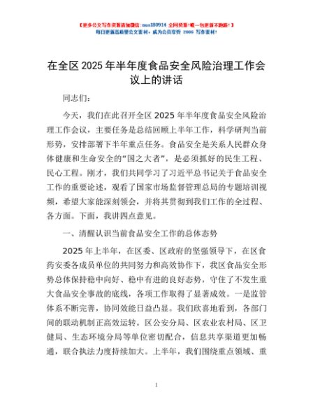 / 在全区2025年半年度食品安全风险治理工作会议上的讲话