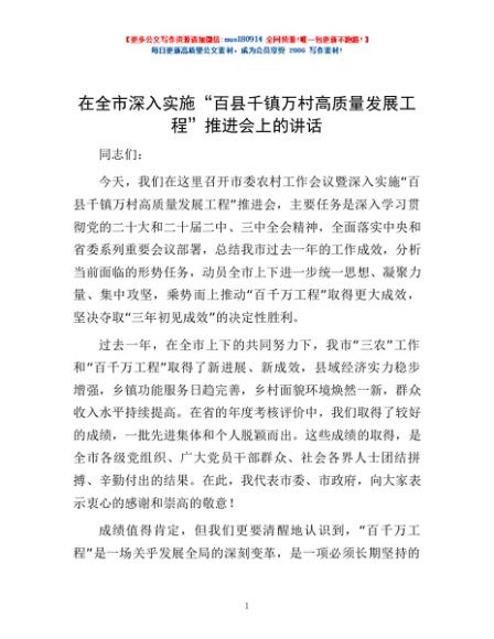 / 在全市深入实施“百县千镇万村高质量发展工程”推进会上的讲话
