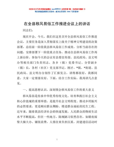 / 在全县移风易俗工作推进会议上的讲话