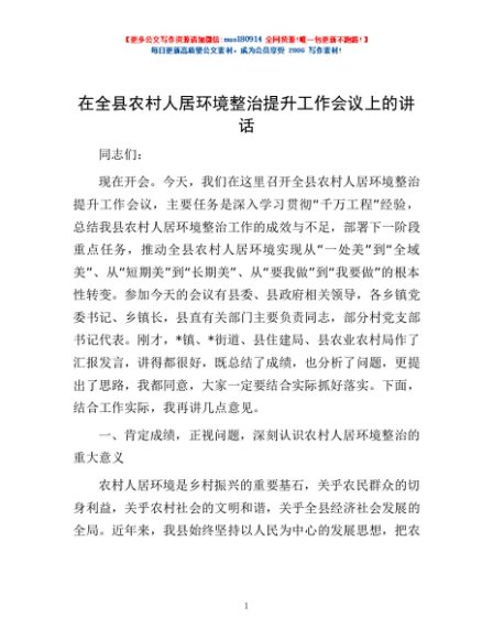 / 在全县农村人居环境整治提升工作会议上的讲话