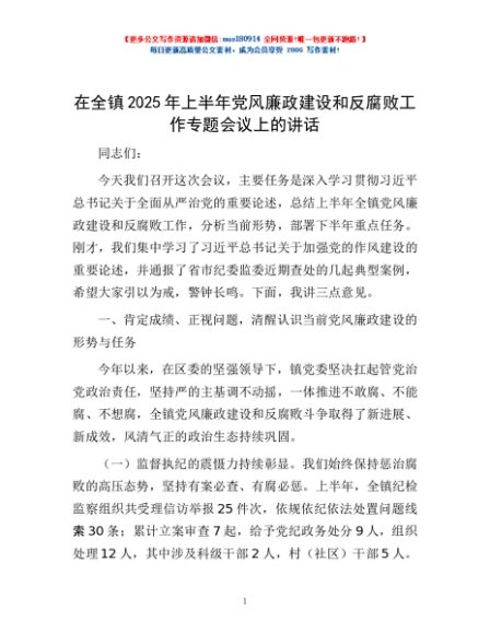 / 在全镇2025年上半年党风廉政建设和反腐败工作专题会议上的讲话