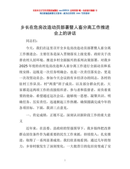 / 乡长在危房改造动员部署暨人畜分离工作推进会上的讲话