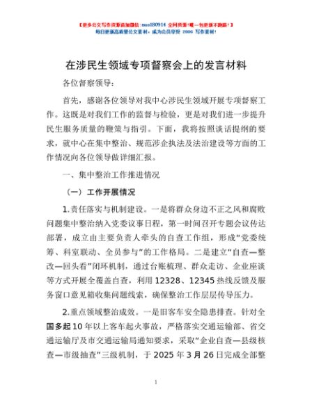 / 在涉民生领域专项督察会上的发言材料