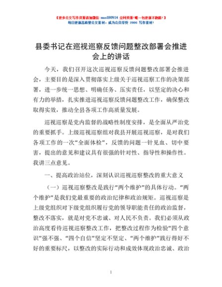 / 县委书记在巡视巡察反馈问题整改部署会推进会上的讲话