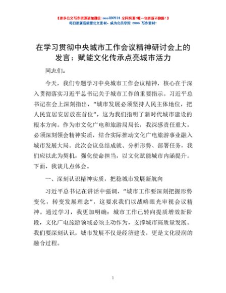 / 在学习贯彻中央城市工作会议精神研讨会上的发言:赋能文化传承点亮城市活力