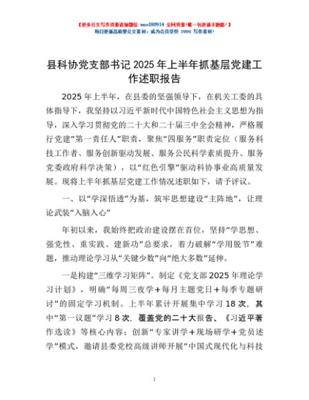 / 县科协党支部书记2025年上半年抓基层党建工作述职报告
