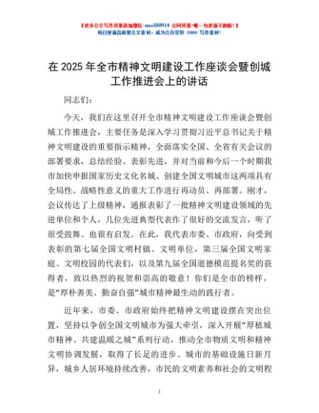 / 在2025年全市精神文明建设工作座谈会暨创城工作推进会上的讲话