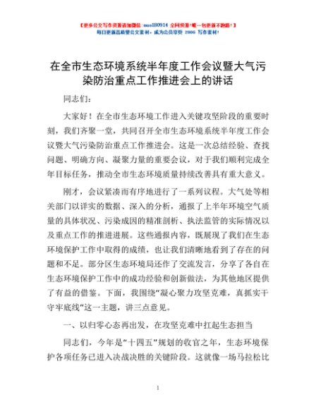 / 在全市生态环境系统半年度工作会议暨大气污染防治重点工作推进会上的讲话