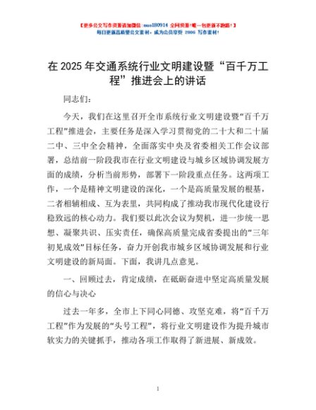 / 在2025年交通系统行业文明建设暨“百千万工程”推进会上的讲话