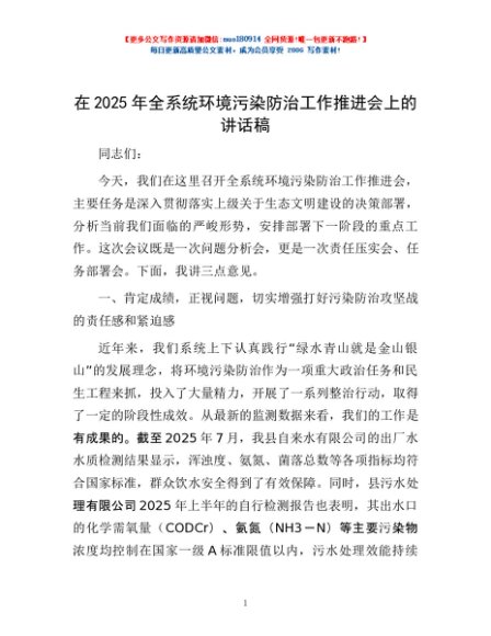 / 在2025年全系统环境污染防治工作推进会上的讲话稿