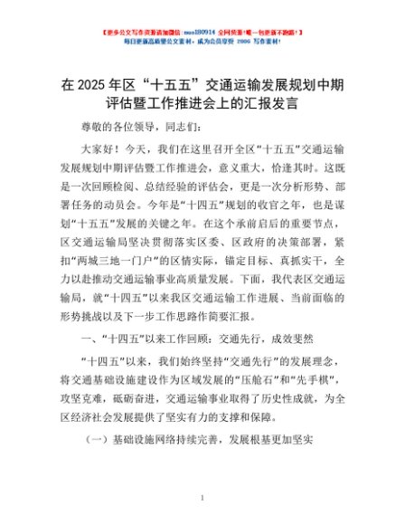 / 在2025年区“十五五”交通运输发展规划中期评估暨工作推进会上的汇报发言