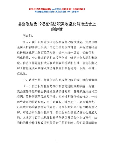 / 县委政法委书记在信访积案攻坚化解推进会上的讲话