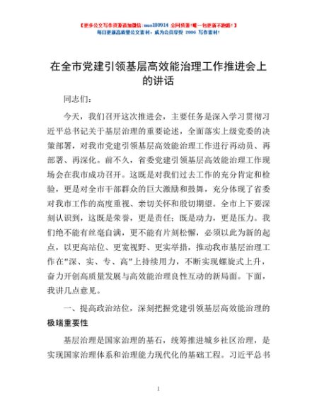 / 在全市党建引领基层高效能治理工作推进会上的讲话
