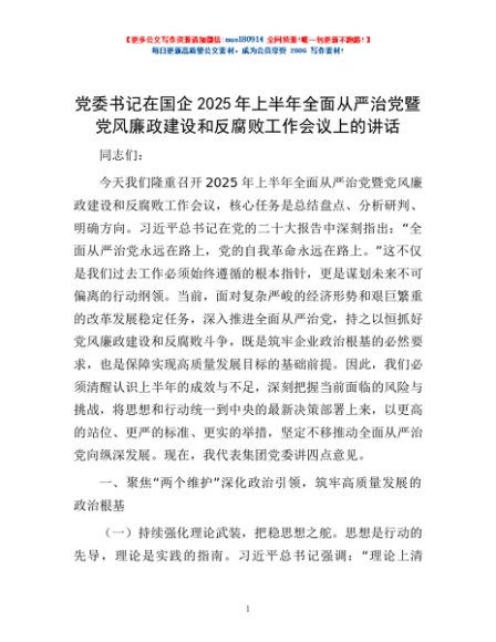 / 党委书记在国企2025年上半年全面从严治党暨党风廉政建设和反腐败工作会议上的讲话