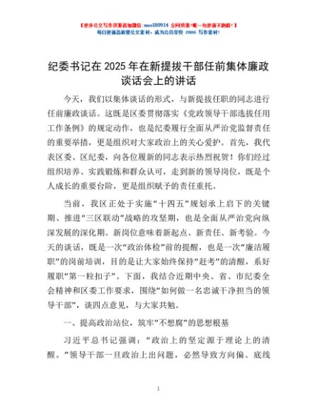 / 纪委书记在2025年在新提拔干部任前集体廉政谈话会上的讲话
