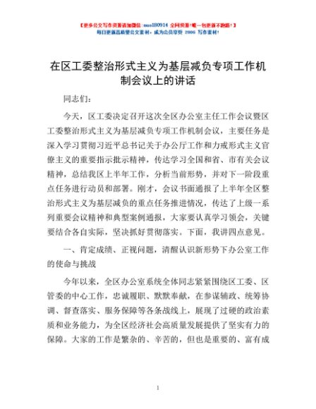 / 在区工委整治形式主义为基层减负专项工作机制会议上的讲话