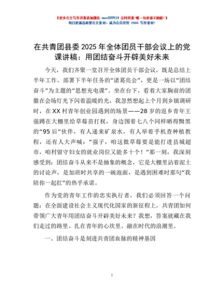 / 在共青团县委2025年全体团员干部会议上的党课讲稿:用团结奋斗开辟美好未来