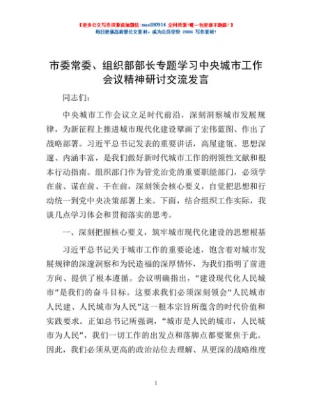/ 市委常委、组织部部长专题学习中央城市工作会议精神研讨交流发言