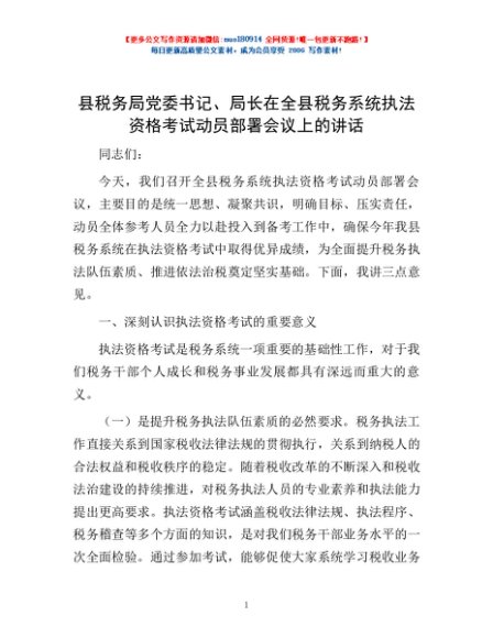 / 县税务局党委书记、局长在全县税务系统执法资格考试动员部署会议上的讲话