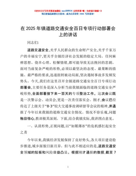 / 在2025年镇道路交通安全百日专项行动部署会上的讲话