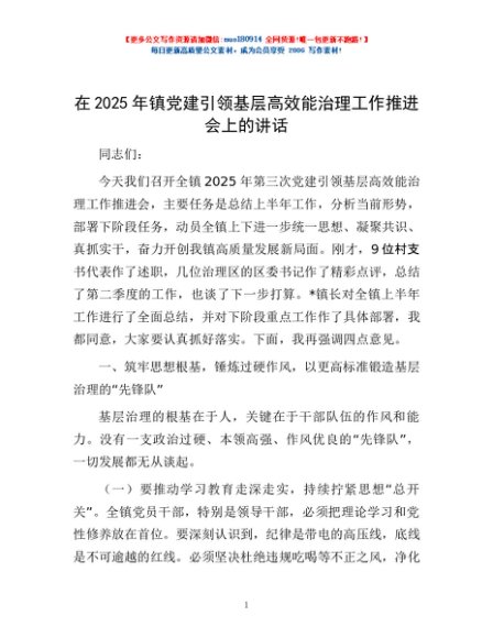 / 在2025年镇党建引领基层高效能治理工作推进会上的讲话
