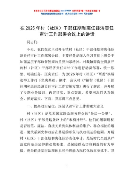 / 在2025年村(社区)干部任期和离任经济责任审计工作部署会议上的讲话