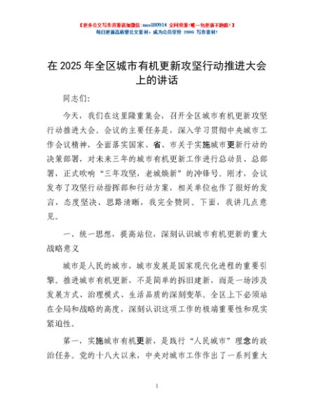 / 在2025年全区城市有机更新攻坚行动推进大会上的讲话