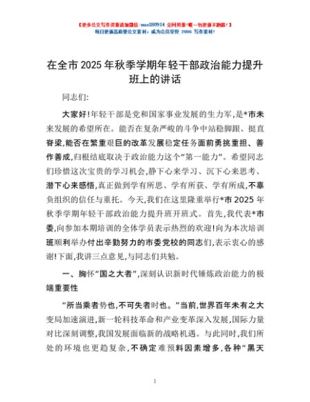 / 在全市2025年秋季学期年轻干部政治能力提升班上的讲话