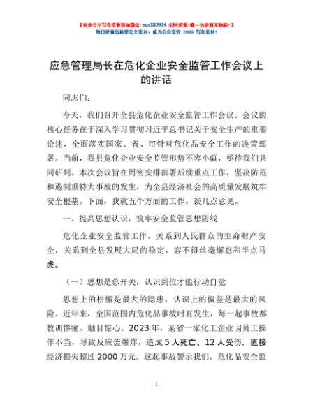 / 应急管理局长在危化企业安全监管工作会议上的讲话