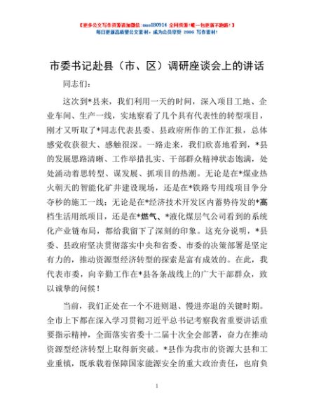 / 市委书记赴县(市、区)调研座谈会上的讲话