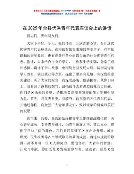 / 在2025年全县优秀青年代表座谈会上的讲话