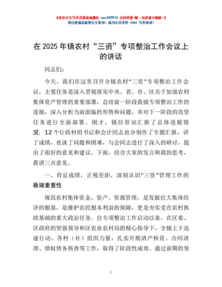 / 在2025年镇农村“三资”专项整治工作会议上的讲话