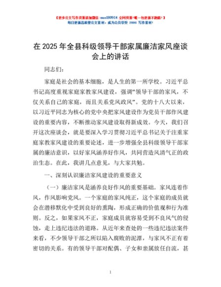 / 在2025年全县科级领导干部家属廉洁家风座谈会上的讲话