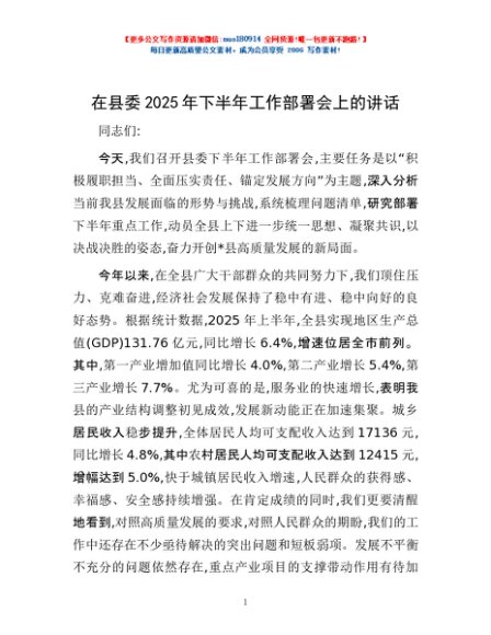 / 在县委2025年下半年工作部署会上的讲话