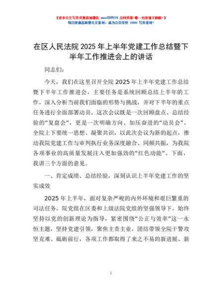 / 在区人民法院2025年上半年党建工作总结暨下半年工作推进会上的讲话