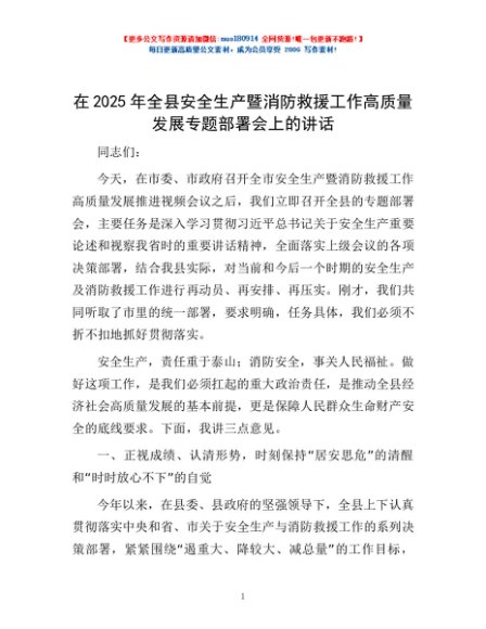 / 在2025年全县安全生产暨消防救援工作高质量发展专题部署会上的讲话