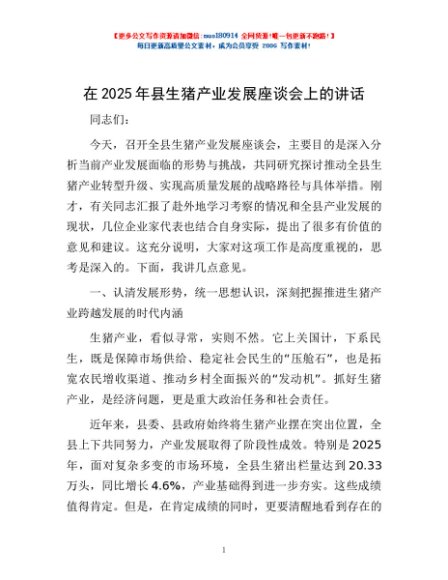 / 在2025年县生猪产业发展座谈会上的讲话