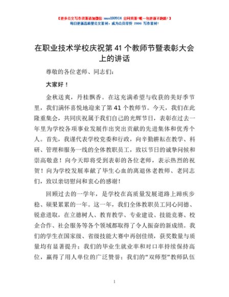 / 在职业技术学校庆祝第41个教师节暨表彰大会上的讲话