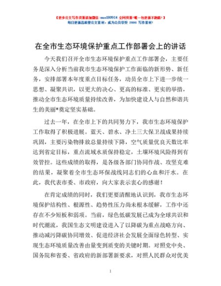 / 在全市生态环境保护重点工作部署会上的讲话