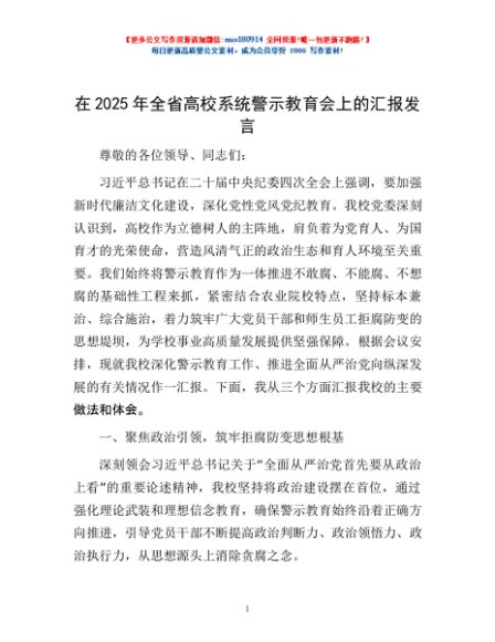 / 在2025年全省高校系统警示教育会上的汇报发言