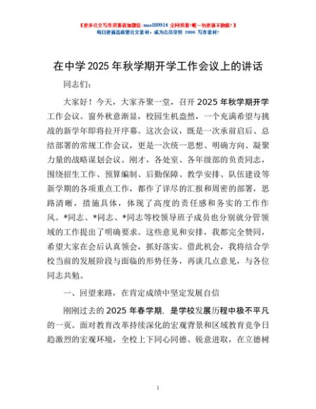 / 在中学2025年秋学期开学工作会议上的讲话