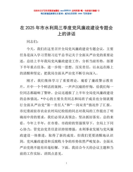 / 在2025年市水利局三季度党风廉政建设专题会上的讲话
