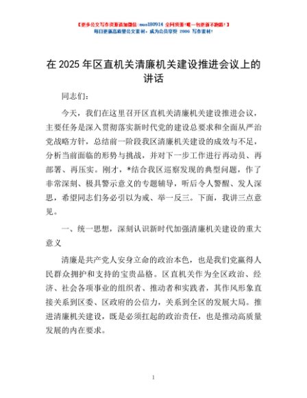 / 在2025年区直机关清廉机关建设推进会议上的讲话