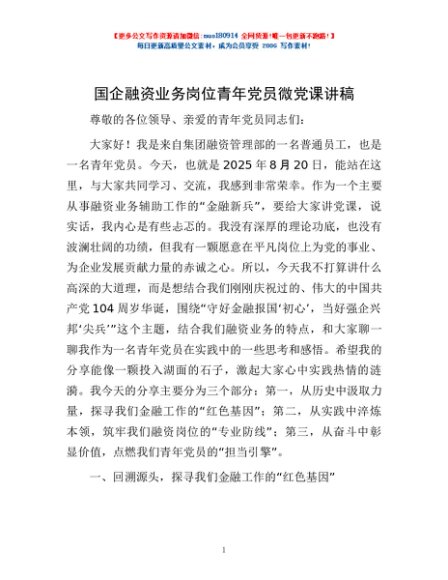/ 国企融资业务岗位青年党员微党课讲稿