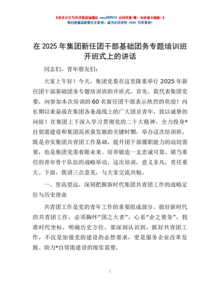 / 在2025年集团新任团干部基础团务专题培训班开班式上的讲话