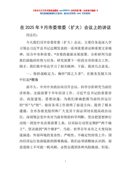 / 在2025年9月市委常委(扩大)会议上的讲话