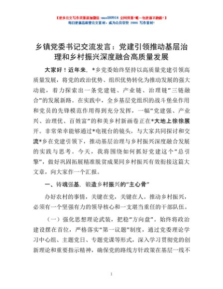 / 乡镇党委书记交流发言:党建引领推动基层治理和乡村振兴深度融合 高质量发展